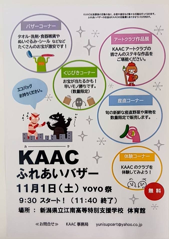 11月1日(土)に、KAACふれあいバザーを江南特別支援学校体育館で開催します。